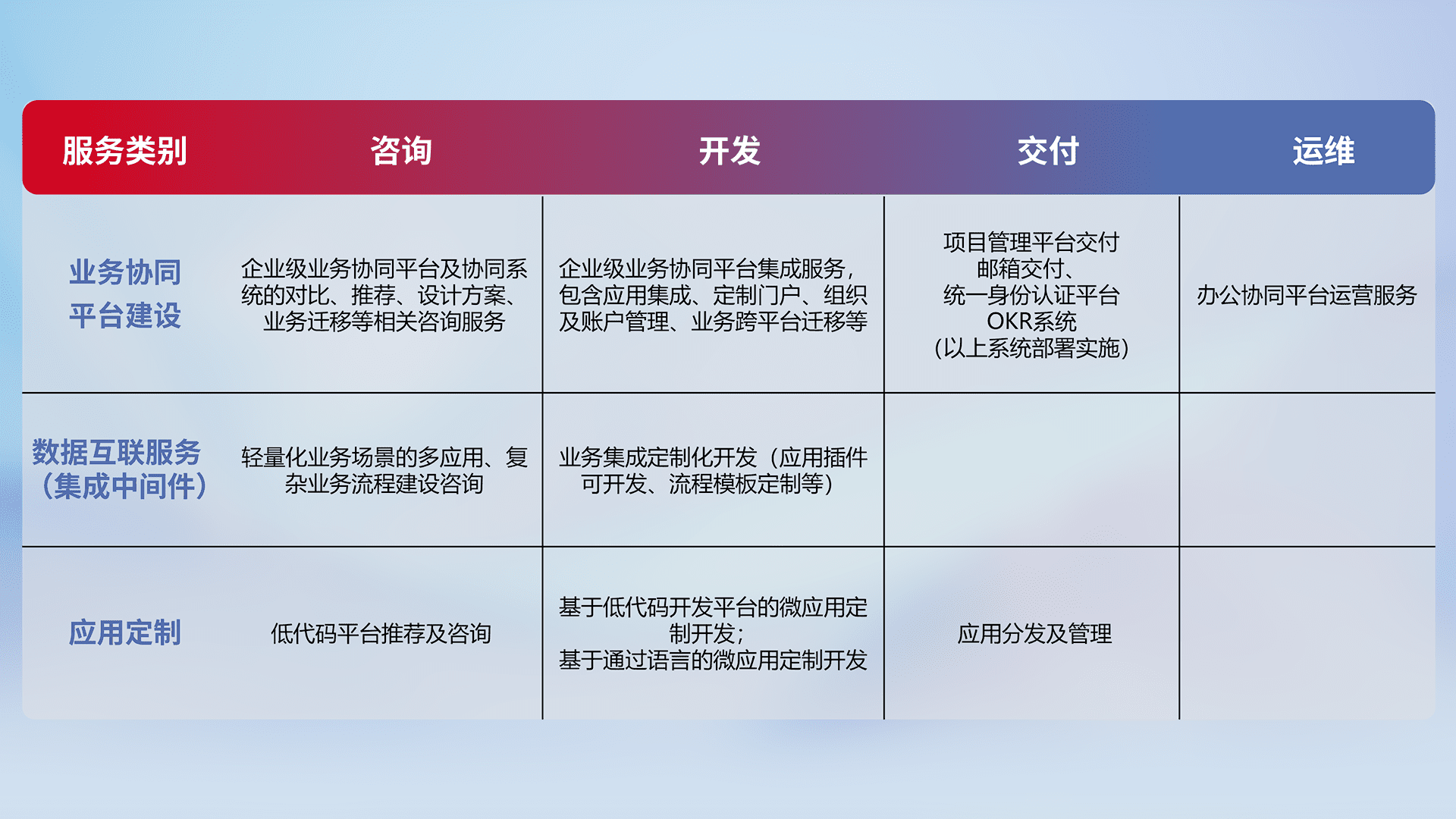 针对钉钉、、企微、、、、IDaas等平台级产品提供产品的规划、、方案、、交付、、、、定制化开发等服务,,,实现如统一协同办公、、智能客户服务、、、混合会议管理、、、智能数据查询、、、等业务场景,,,,实现数字化转型。。。。