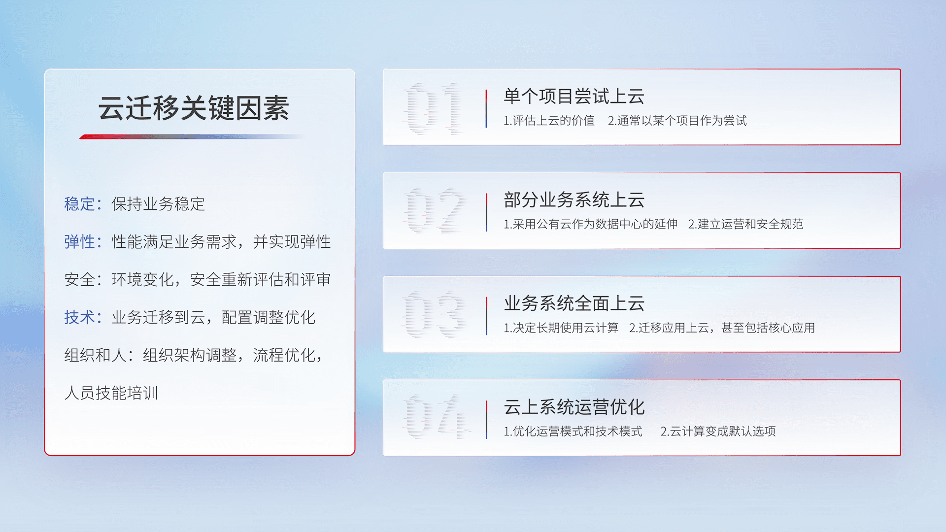 结合实际业务,,,从规划设计、、、云平台选型、、、云原生改造、、、、数据迁移、、、、集成交付,,,,迁移全过程为客户识别最佳上云路径,,做好风险识别管理,,,,设计网络架构、、身份权限、、、、安全审计合规、、、操作审计、、日志审计、、监控告警策略、、多站点容灾设计等,,,对云上基础设施进行整体规划,,,,提升IT治理水平,,以满足弹性、、、高可用、、、、高性能的需求。。
