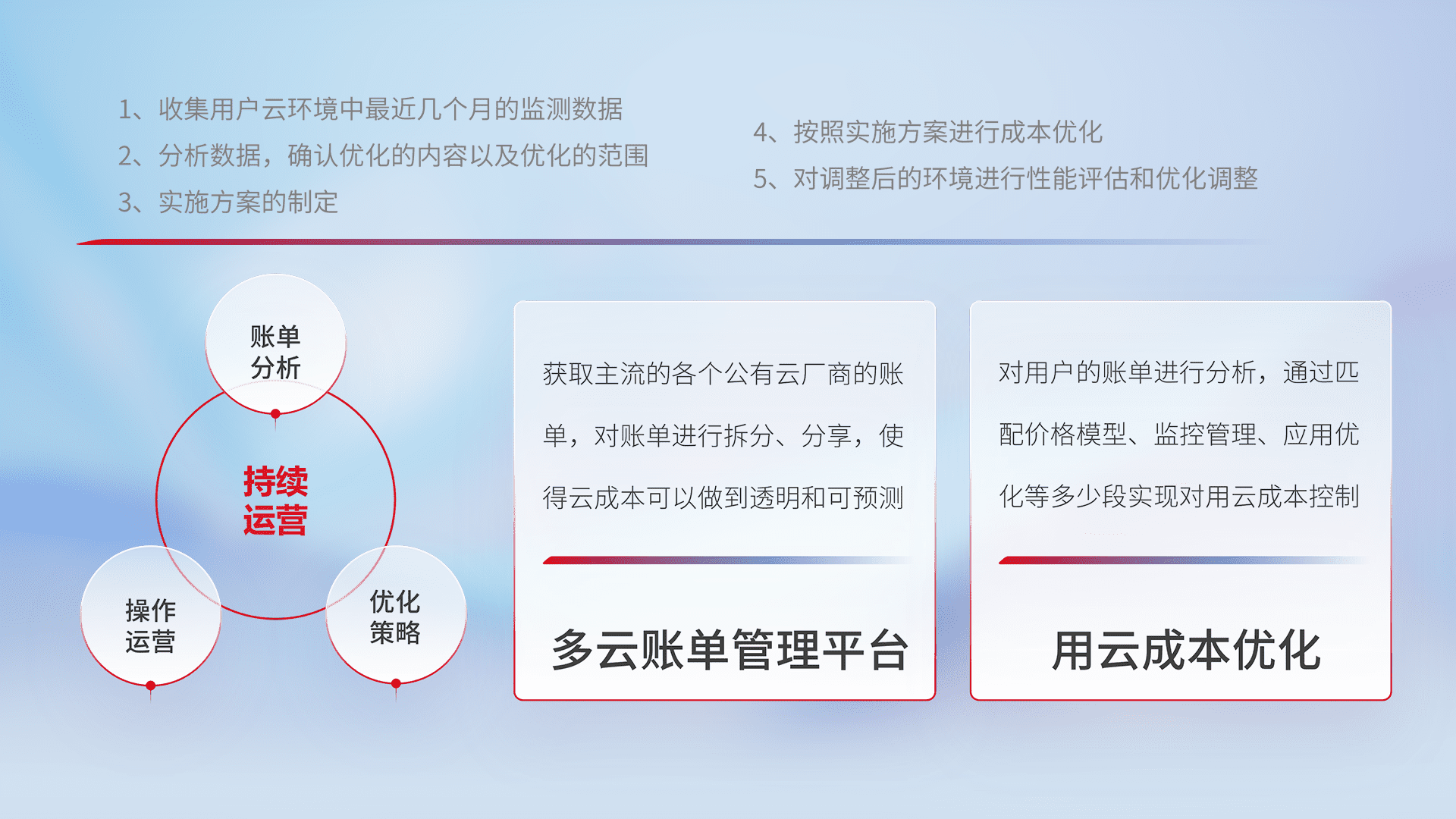 通过多云纳管,,以统一的资源数据模型把客户的云资源进行抽象和封装,,进而实现对多云资源的统一操作,,,,保障云资源管理的可靠性、、、、稳定性与可用性。。。。量身定制化运维内容,,,,配置、、开发运维、、、、补丁管理、、、备份、、、监控、、认证和访问管理、、、、审计和日常巡检等,,,,保障在用云过程中的可靠度,,,,稳定度以及高可用率。。